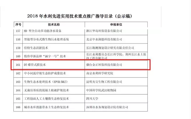 12月26日,水利部科技推廣中心發布公示,216個先進實用技術被納入《2018年水利先進實用技術重點推廣指導目錄》。經水利部科技推廣中心專家委員會按照《水利先進實用技術重點推廣指導目錄管理辦法》評審,金正環保“DT碟管式膜技術”以科學的技術原理、先進和有效的技術性能指標、成熟的技術工藝、合理的成本價格和良好的應用效益、應用前景等優勢,在眾多技術項目中脫穎而出,成功入圍《2018年水利先進實用技術重點推廣指導目錄》。