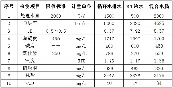 廠區(qū)內(nèi)現(xiàn)有項目產(chǎn)生的循環(huán)排污水和反滲透濃水均排入10000 m3/d污水處理廠內(nèi)處理。由于此部分水量較大,對污水處理站負擔(dān)大,且對水資源也是一種浪費。經(jīng)齊魯制藥相關(guān)技術(shù)人員化驗得知,此部分高濃度廢水電導(dǎo)率、硬度、濁度和鹽分較高,而COD較低,如果直接排入污水處理車間進行處理不太合理,不僅會加重污水處理的成本,處理效果也不夠理想。